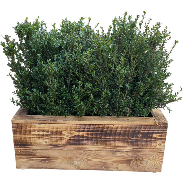 Buxushaag van 90 cm hoog en 100 cm breed. Standaard geleverd in een terracottakleurige sierbak.